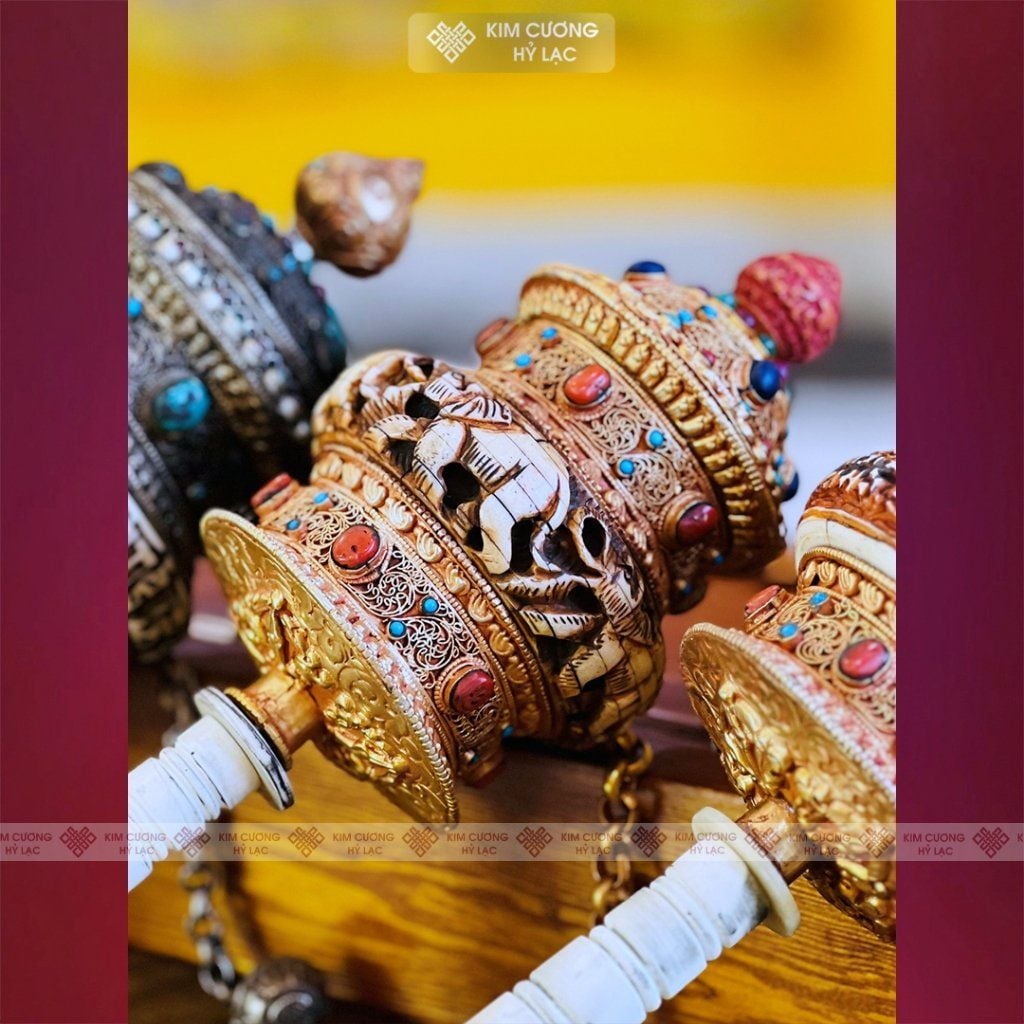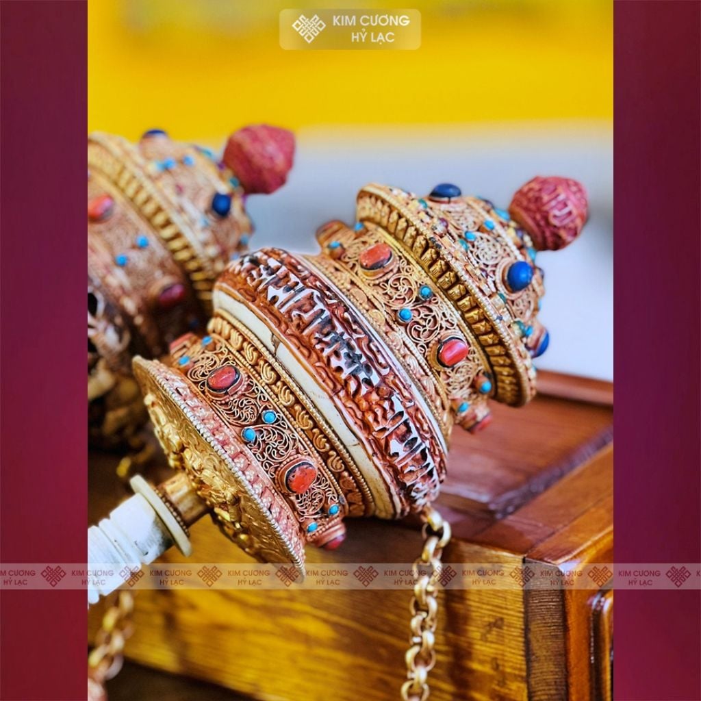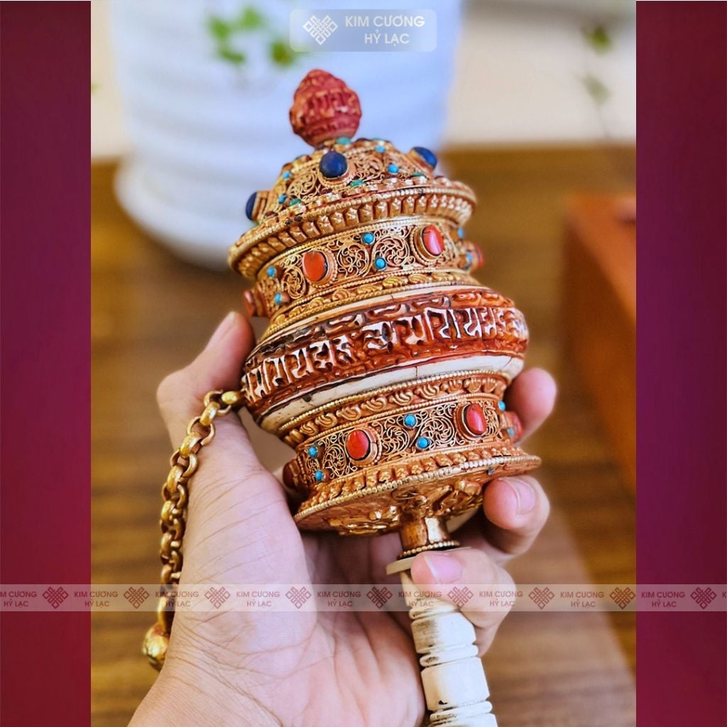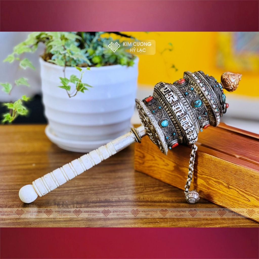 Kinh Luân Cầm Tay Nepal Nạm Bạc Thủ Công [Kim Cương Hỷ Lạc] 36Cm