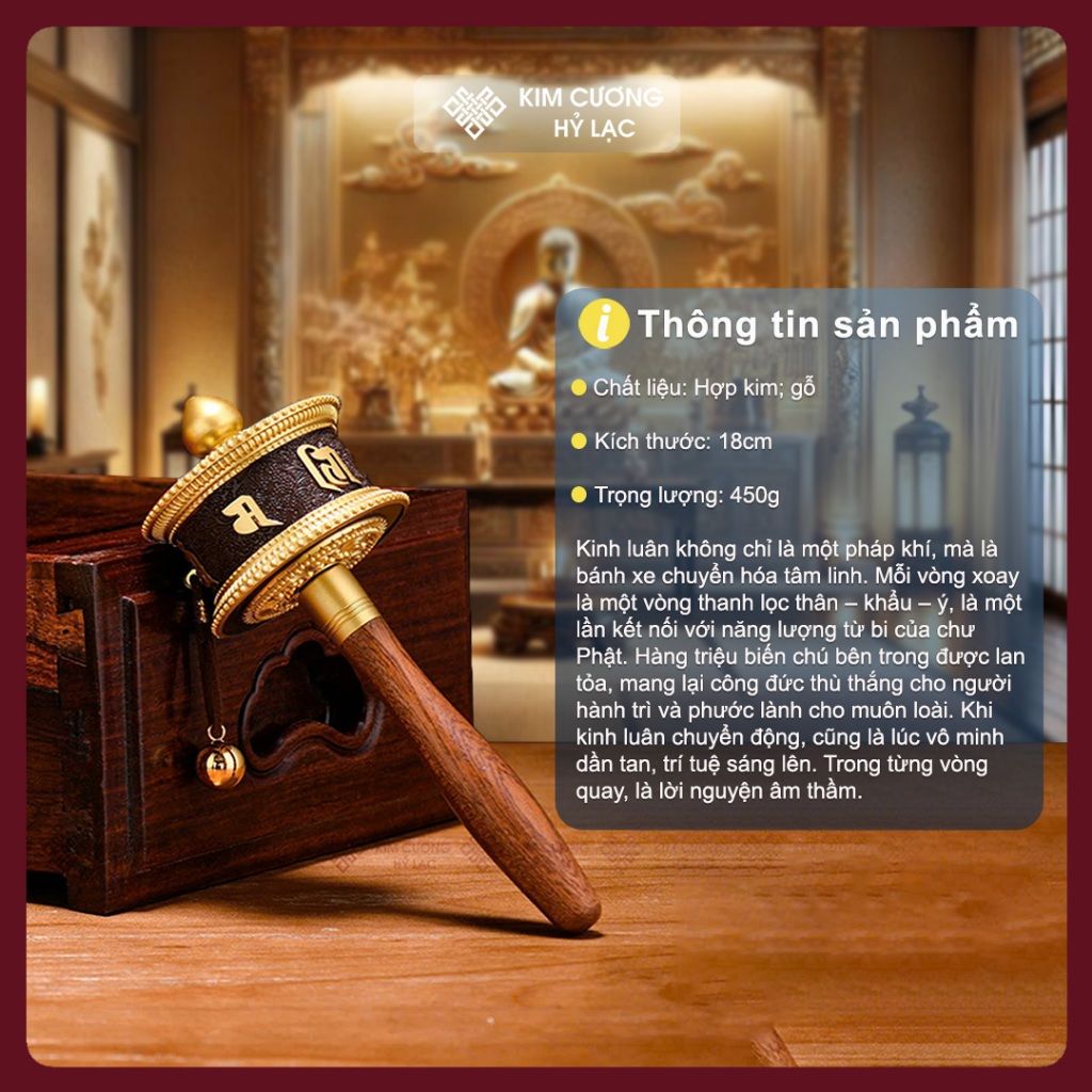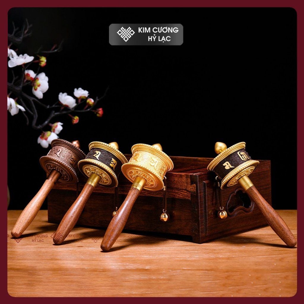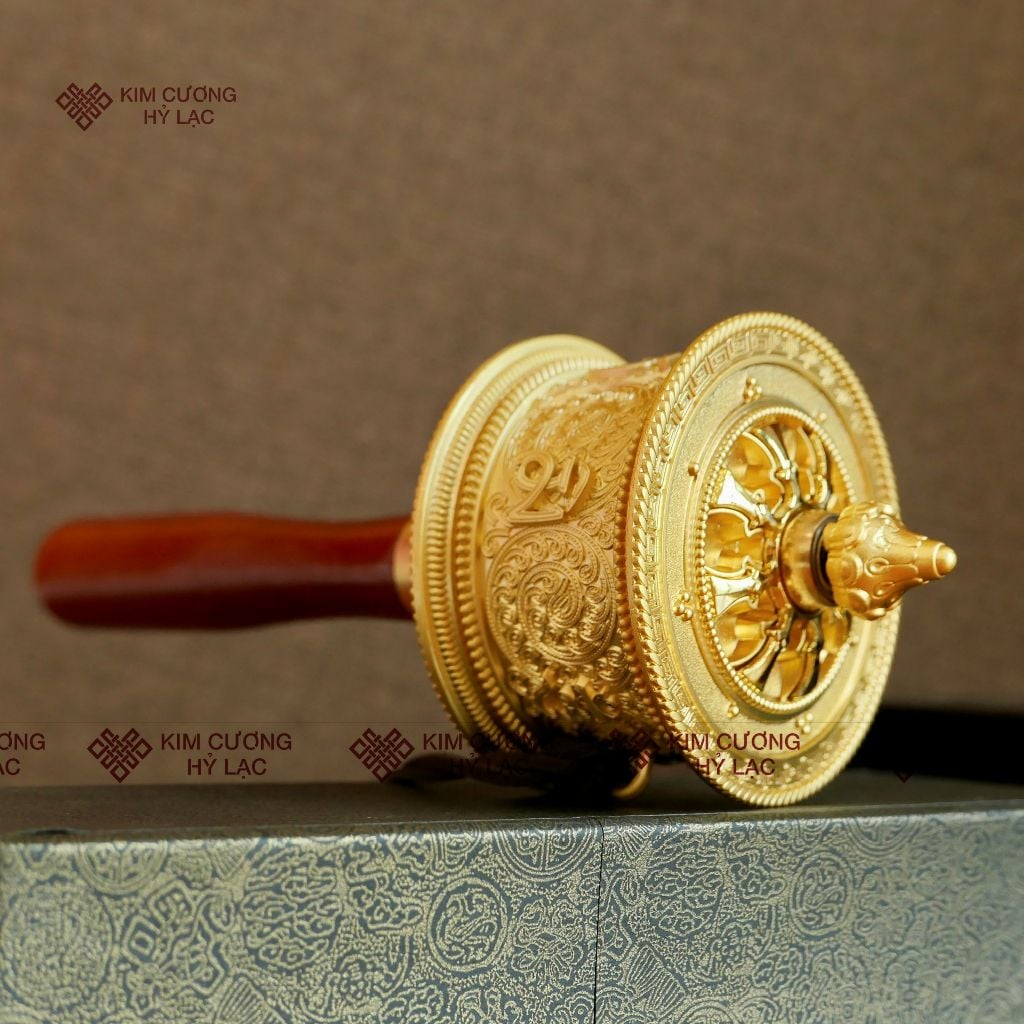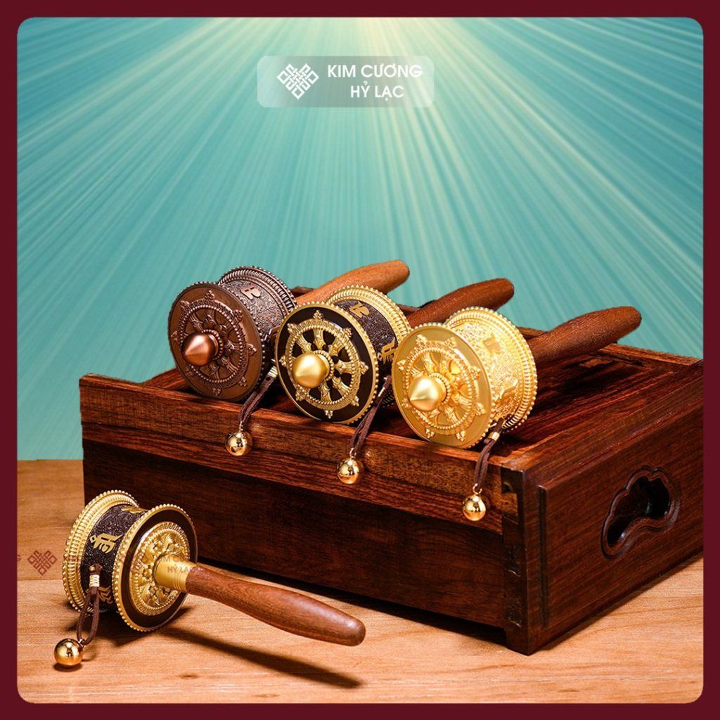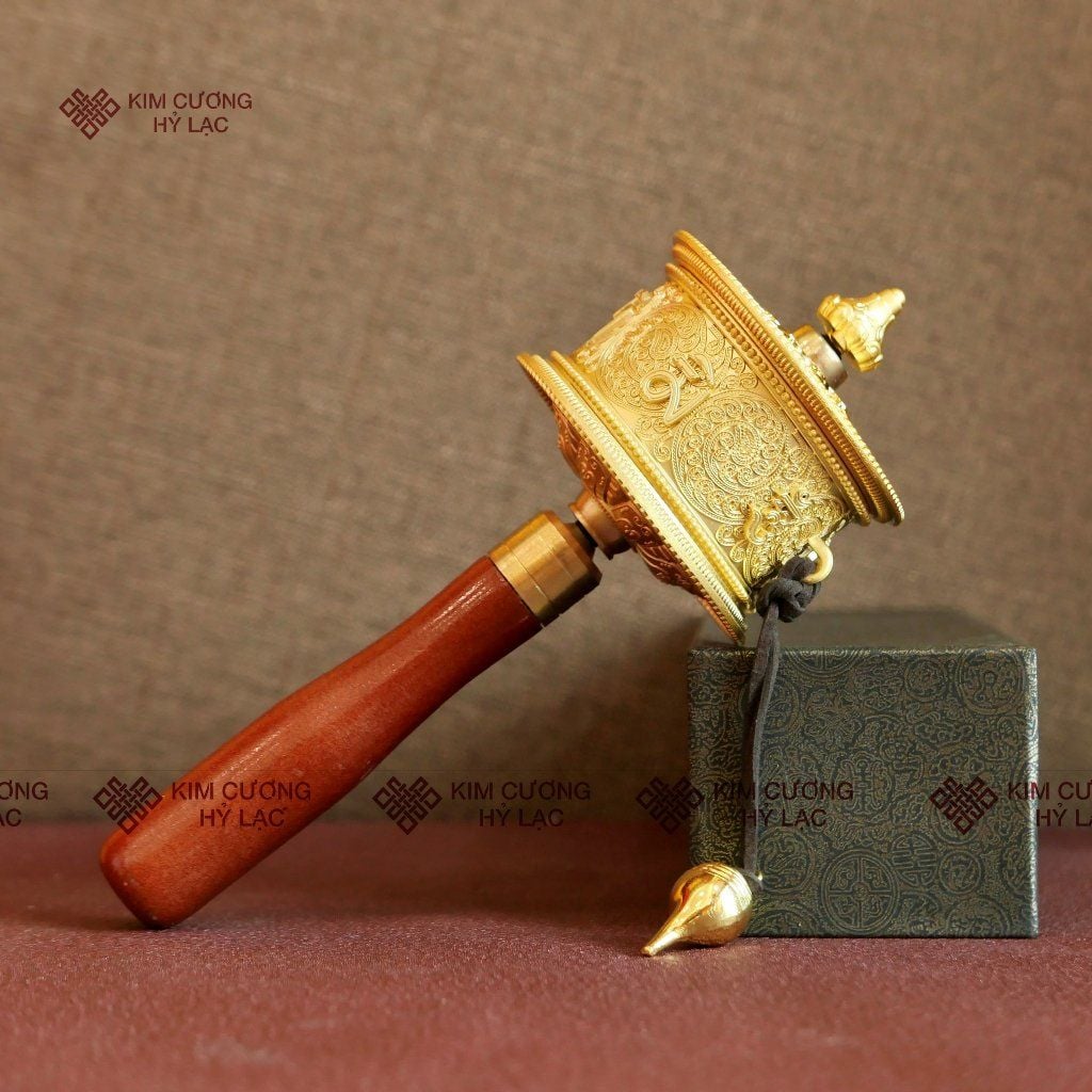 Kinh Luân Cầm Tay Tây Tạng Màu Vàng Mật Tông Loại 18cm [Kim Cương Hỷ Lạc] Kinh Luân Cầm Tay Hợp Kim